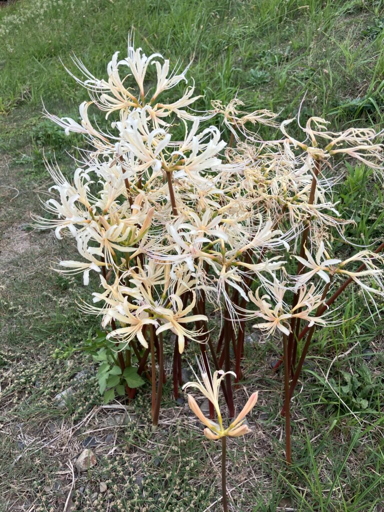 ここ最近増えたという白い彼岸花。シロバナマンジュシャゲ。ネット情報によると、原種の赤に黄を交配したもののらしい。瀬戸川のシロバナマンジュシャゲは自然交配なのか、誰かが球根を植えたのか。